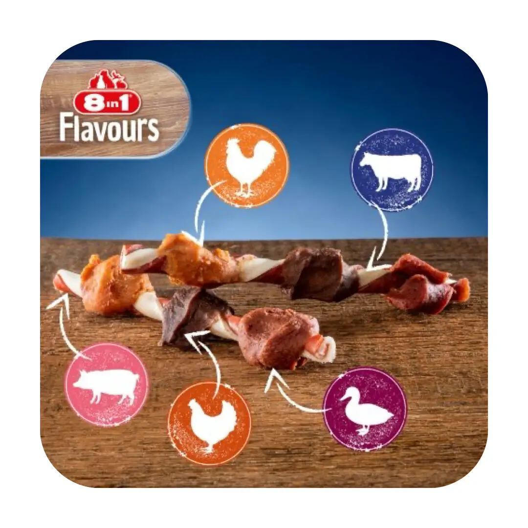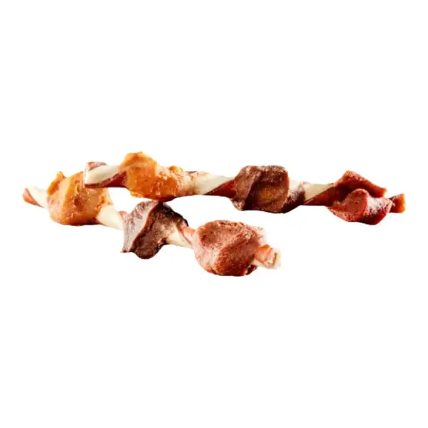 Sjovt tyggeben udformet som et grillspyd af okse- og svinehud med tørrede kødstykker fra kylling, and og lever.