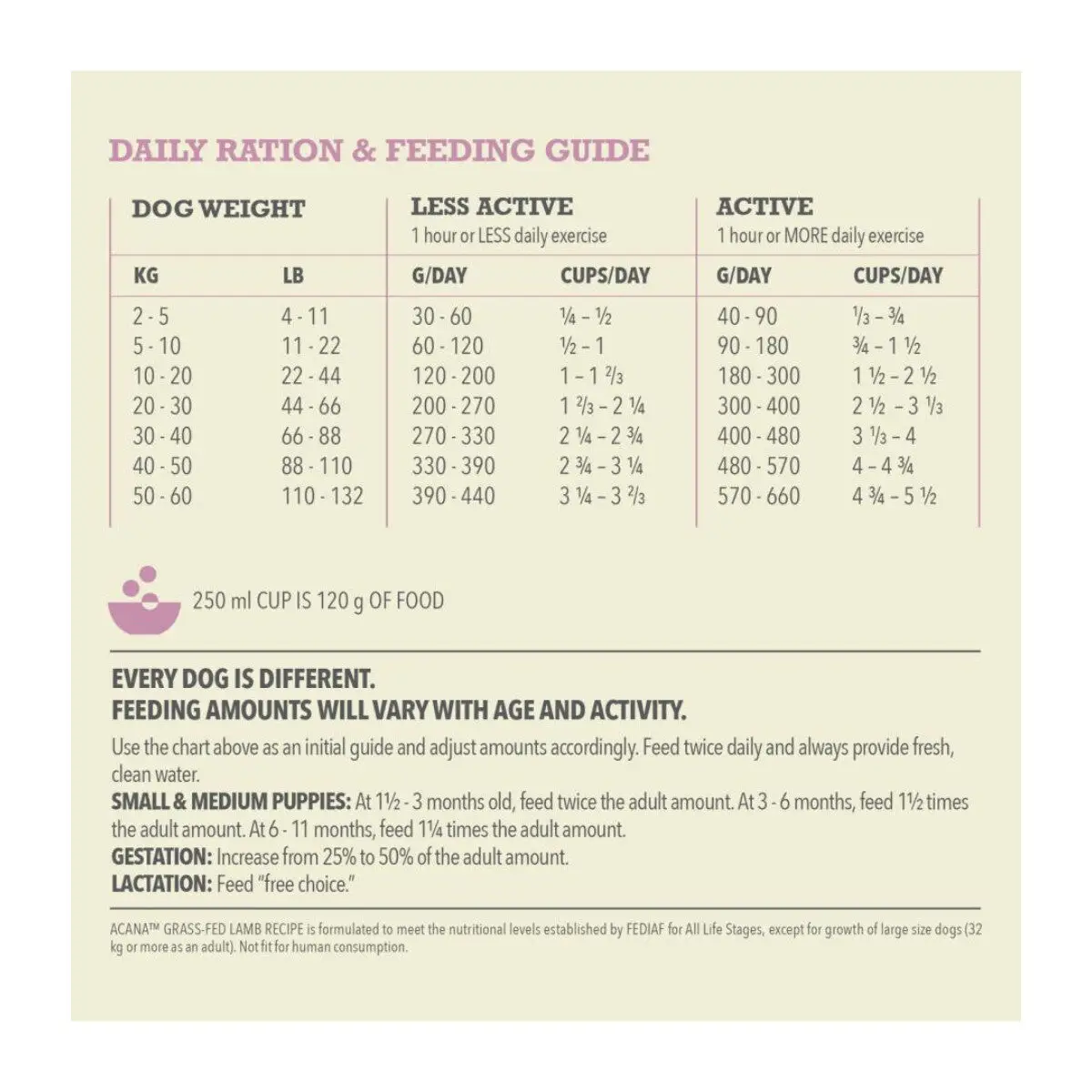Acana Grass-Fed Lamb er et naturligt, kornfrit fuldfoder med 50 % animalsk indhold, hvor lam er den eneste proteinkilde. Ideelt til hunde med foderintolerance eller sensitiv fordøjelse. Foderet er beriget med fibre, præbiotika og udvalgte frugter og grøntsager – herunder Red Delicious-æbler – som understøtter en sund mave og en stærk krop. Uden korn, kartofler, gluten eller kunstige tilsætninger. Velegnet til voksne hunde af alle racer og størrelser.