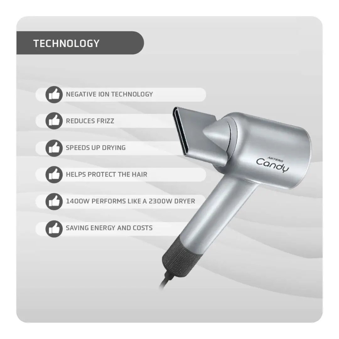 En let, støjsvag og effektiv hårtørrer, der giver et professionelt resultat hver gang. Artero Candy er et sikkert valg til både salon og hjemmebrug.