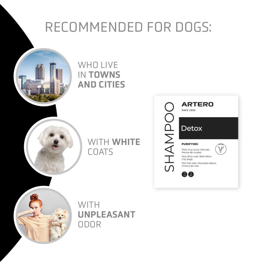 Ud over at være udviklet til byhunde og pels udsat for forurening, er Artero Detox også et godt valg til hvid pels. Når hvid pels bliver påvirket af snavs, støv og fedt, mister den hurtigt sit friske og rene udtryk. En dybderensende shampoo kan her hjælpe med at løfte pelsen og få den til at fremstå klarere og mere glansfuld igen. Det gør produktet oplagt til hunde, hvor pelsen let ser trist ud, eller hvor man gerne vil genskabe et mere friskt og velplejet resultat efter badet.