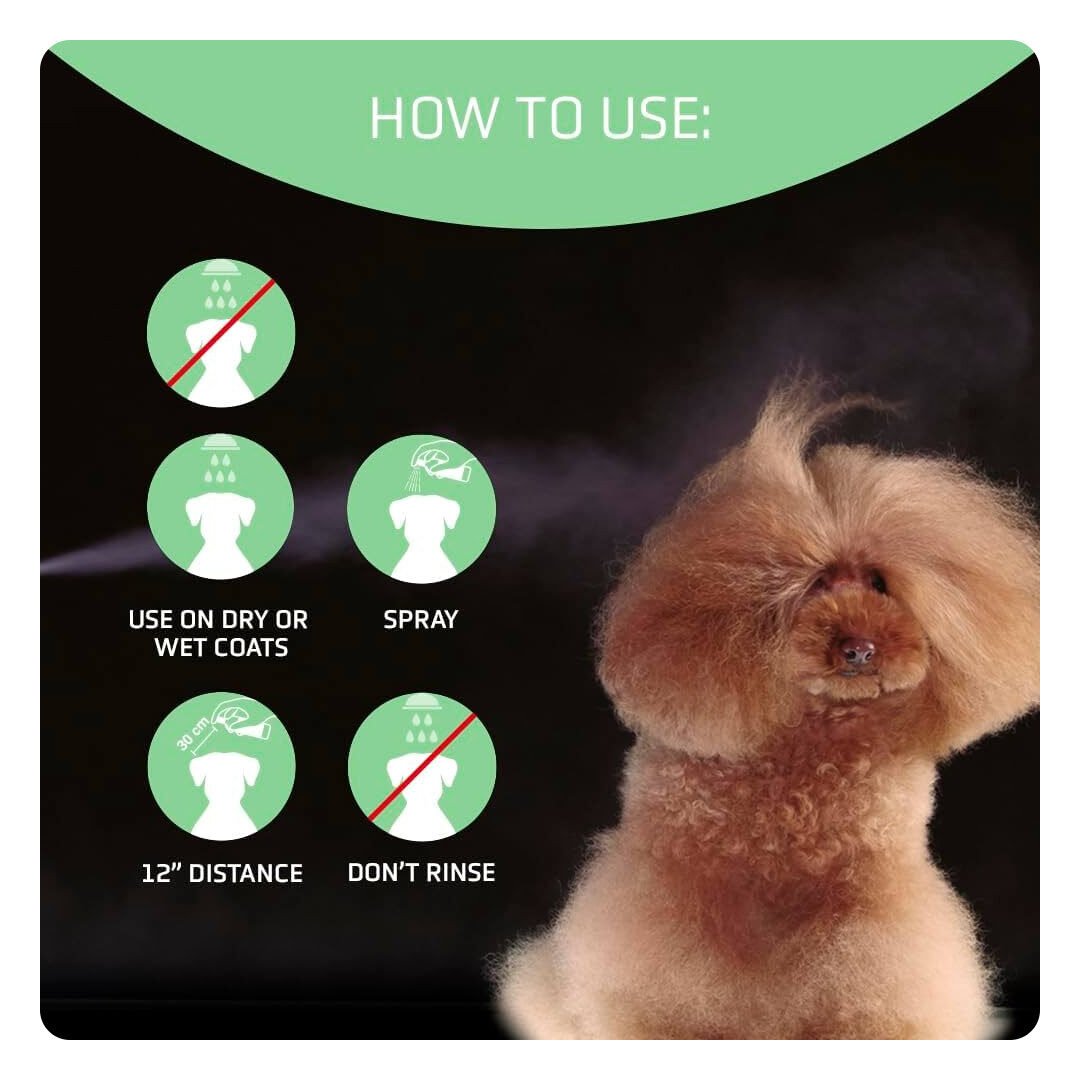 Spray balsammen jævnt i pelsen, enten mens den er let fugtig efter bad eller direkte i tør pels. Arbejd produktet ind med en børste eller hænderne, så det fordeles i hele pelsen. Balsammen skal ikke skylles ud. Den kan anvendes efter behov, både som en del af den faste plejerutine og som hurtig opfriskning mellem bade.