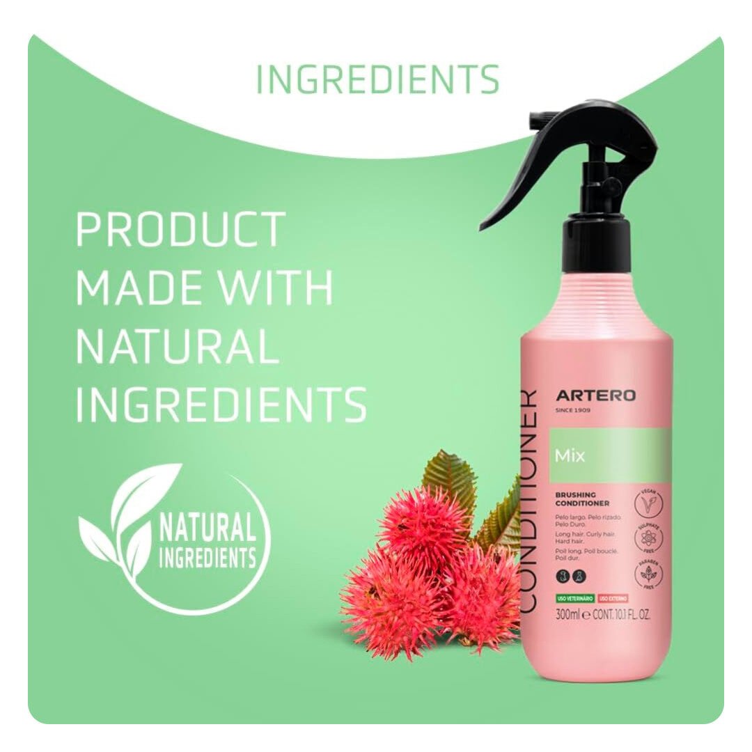 Artero Mix er en leave-in hundebalsam, der sprayes direkte i våd eller tør pels uden behov for skylning. Den gør børstningen lettere med sin friktionsneutrale effekt og hjælper med at give pelsen blødhed, glans og mere volumen. Velegnet til både kort og lang pels og ideel til hunde, der ikke bryder sig om lange bade. En praktisk løsning til daglig pelspleje hjemme eller i salon.