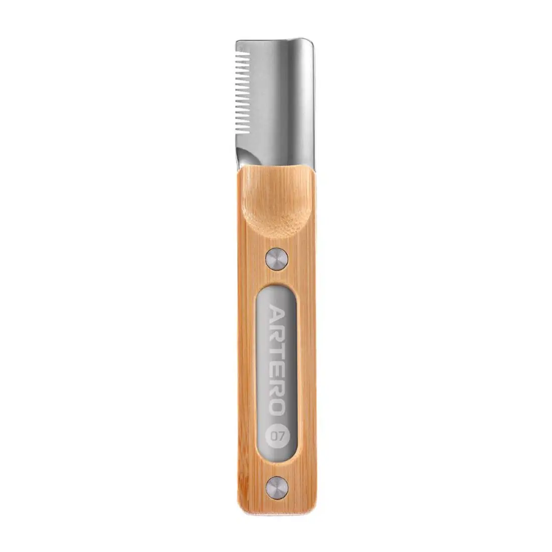 Denne grove trimmekniv fra Artero er udviklet til højrehåndede og ideel til stripping af medium-lange ruhårede pelse og tæt underuld. De grove tænder i rustfrit stål gør det nemt at fjerne dækhår og løs pels, mens bambushåndtaget giver et ergonomisk og stabilt greb. Let, komfortabel og slidstærk – et professionelt redskab til hundeejere og groomere, der ønsker et effektivt og pålideligt værktøj.