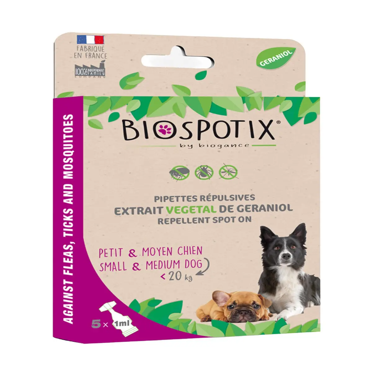 Biospotix Spot On til små hunde er en naturlig og giftfri løsning til forebyggelse af lopper, flåter og myg. Produktet indeholder et geraniol-baseret plantekompleks, som skadedyrene ikke bryder sig om. Når væsken dryppes på hundens nakke og ryg, frigives de aktive BIOSPOTIX-komponenter gradvist og fordeles over kroppen via talg, hvilket skaber en effektiv beskyttende barriere mod parasitter.