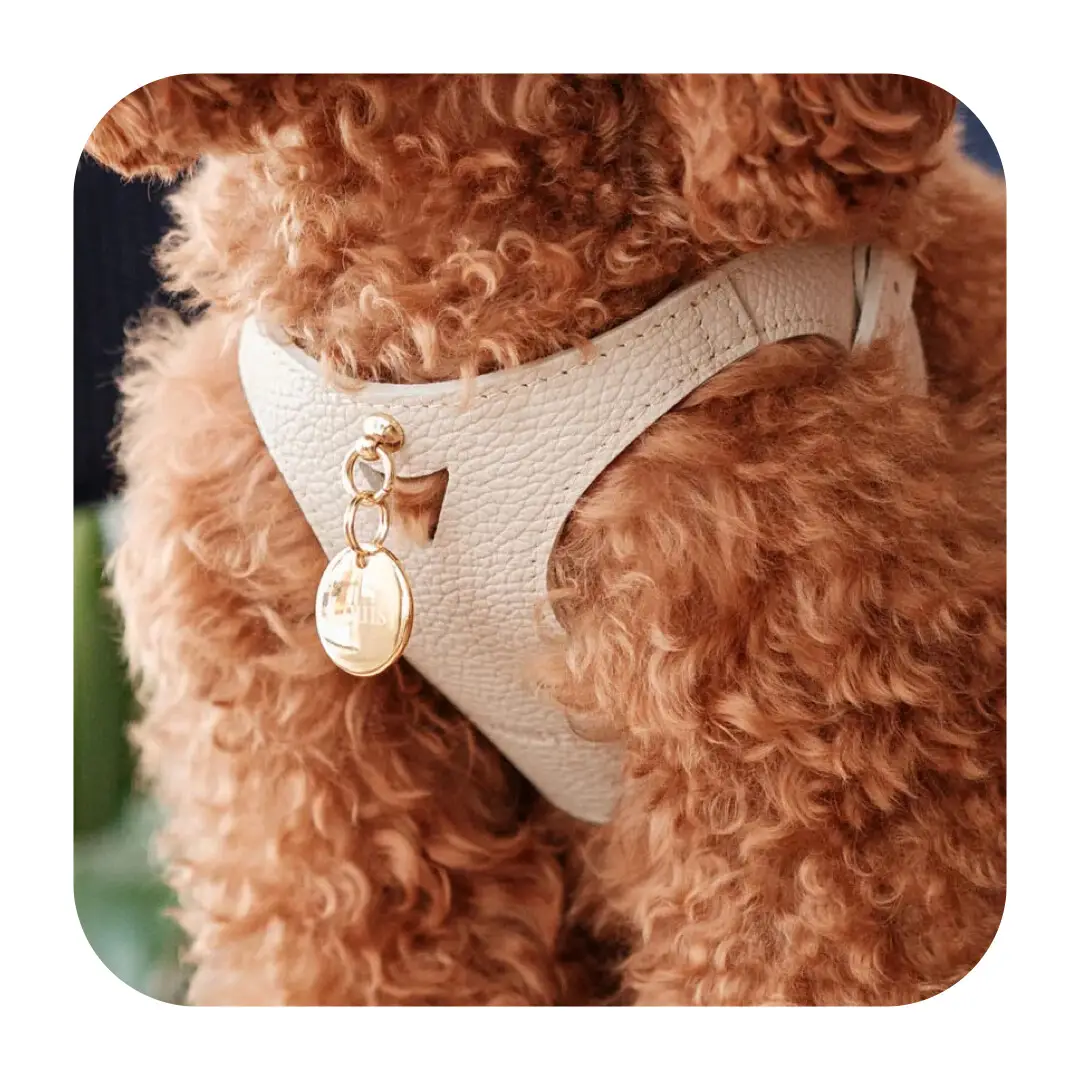 Den lyse sandfarvede nuance giver hundeselen et moderne og raffineret udtryk, der passer perfekt til hundeejere, som ønsker et let og sofistikeret look. Sammen med de guldfarvede spænder og vedhæng skabes en eksklusiv finish, der gør, at selen skiller sig ud fra almindeligt hundeudstyr.