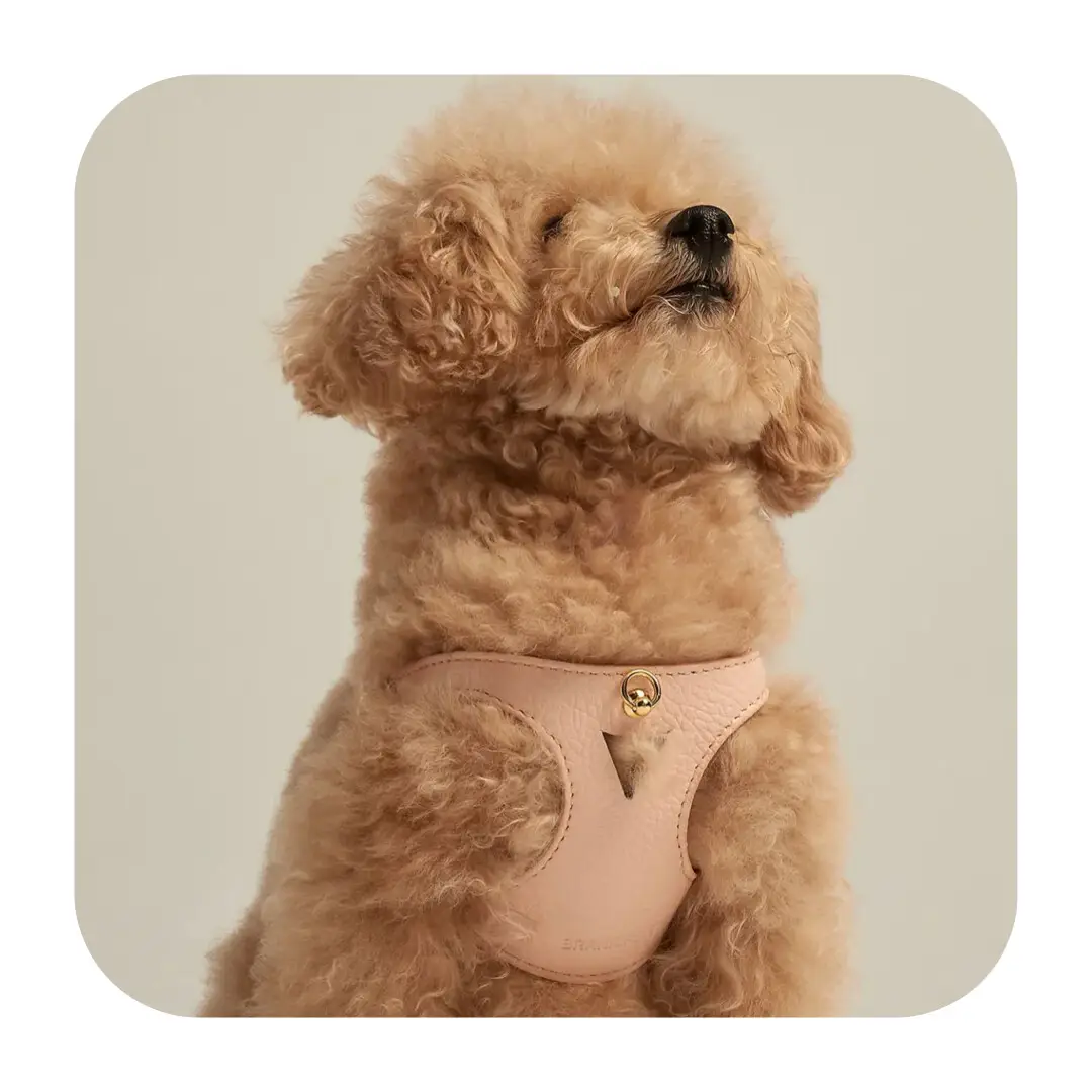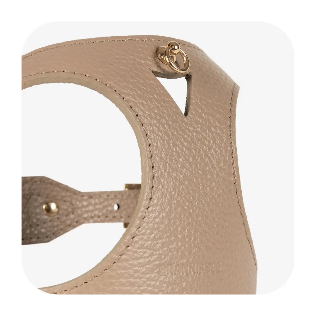 Branni Pets Juno Designer Hundesele Sandfarvet kombinerer luksus, komfort og italiensk elegance i ét produkt. Fremstillet af italiensk læder i høj kvalitet, udsmykket med guldfarvede detaljer og designet med hundens velvære i centrum, er den et oplagt valg for stilbevidste hundeejere.