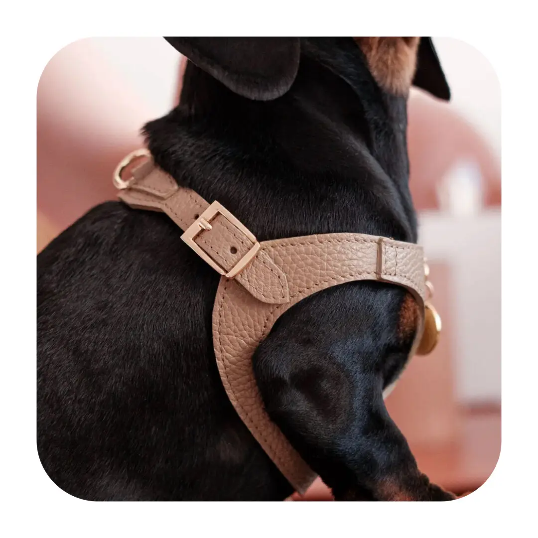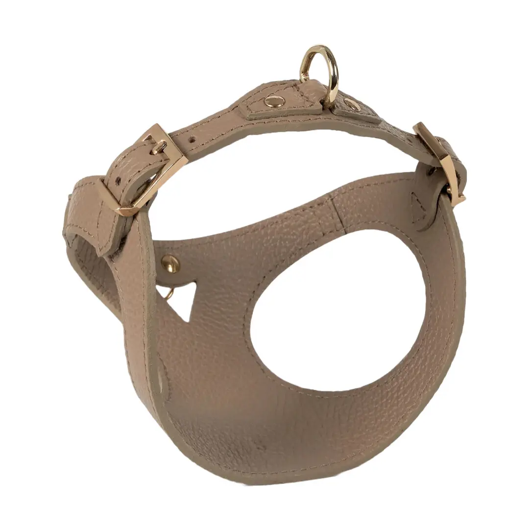 Branni Pets Juno Designer Hundesele i sandfarvet læder er et eksklusivt valg til hundeejere, der ønsker at kombinere komfort, funktionalitet og italiensk elegance. Fremstillet af ægte italiensk læder og udsmykket med guldfarvede detaljer, er denne sele skabt til at forvandle hver gåtur til en stilfuld oplevelse.