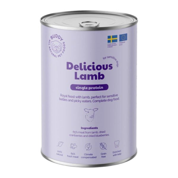 Buddy Delicious Lamb er et kornfrit vådfoder baseret på singleprotein og monoprotein med lam som eneste animalske proteinkilde. Med 65 % lam får din hund et velsmagende og letfordøjeligt måltid, der er velegnet til hunde med følsomme maver eller behov for enkel fodring. Tilsætning af superfoods som tang, tranebær og blåbær bidrager til et naturligt og balanceret vådfoder, der også appellerer til kræsne hunde.
