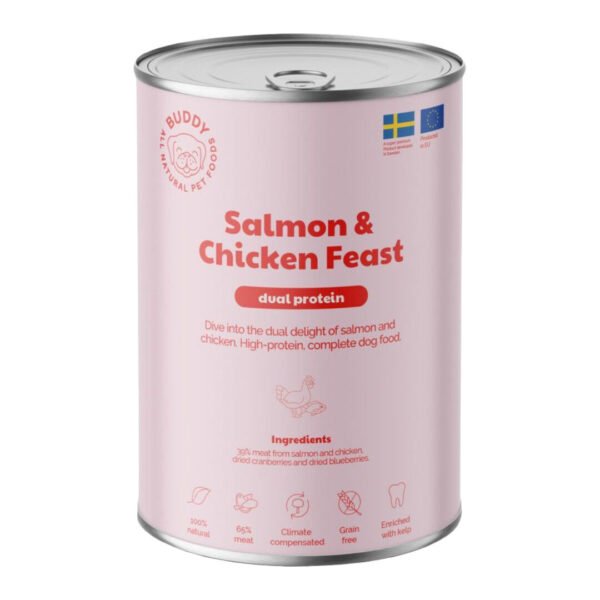 Buddy Salmon & Chicken Feast er et kornfrit vådfoder med dobbelt protein fra kylling og laks. Kombinationen af magert fjerkræ og fed fisk giver et velsmagende og letfordøjeligt måltid, som også tilfører naturlige omega-3 fedtsyrer. Med højt indhold af kød og fisk samt tilsætning af superfoods som tang, tranebær og blåbær får din hund et naturligt vådfoder, der appellerer til selv kræsne hunde og giver god variation i fodringen.