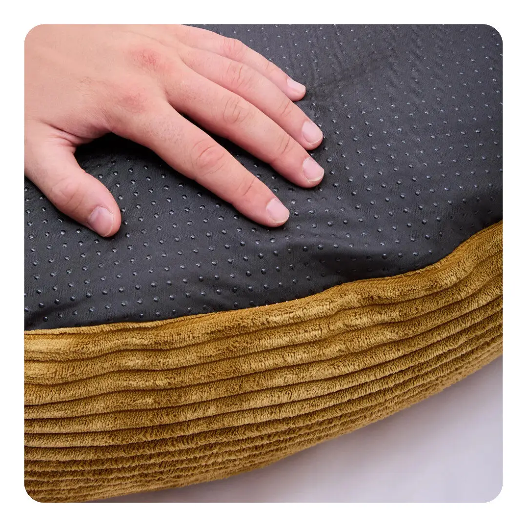 Denne hundeseng er produceret i EU, og kvaliteten føles tydeligt anderledes end på mange andre hundesenge på markedet. Det mærkes både i stoffets tyngde, i sengens form og i den måde, den passer ind i hjemmet. Den mustardfarvede fløjlslook-overflade giver et lunt og indbydende udtryk, som gør, at sengen ikke bare bliver hundens plads, men også en del af indretningen. Det er en seng, man faktisk har lyst til at have stående fremme i stuen, soveværelset eller det hyggelige hjørne, hvor hunden bedst kan lide at slappe af.