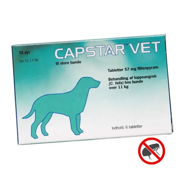 Når din hund plages af lopper, er Capstar Vet piller den optimale løsning, der giver hurtig og effektiv lindring. Specielt designet til mellemstore og store hunde med en vægt på 11-57 kg, fjerner Capstar Vet voksne lopper hurtigt og hjælper med at bryde loppens livscyklus, så din hund kan føle sig godt tilpas igen.