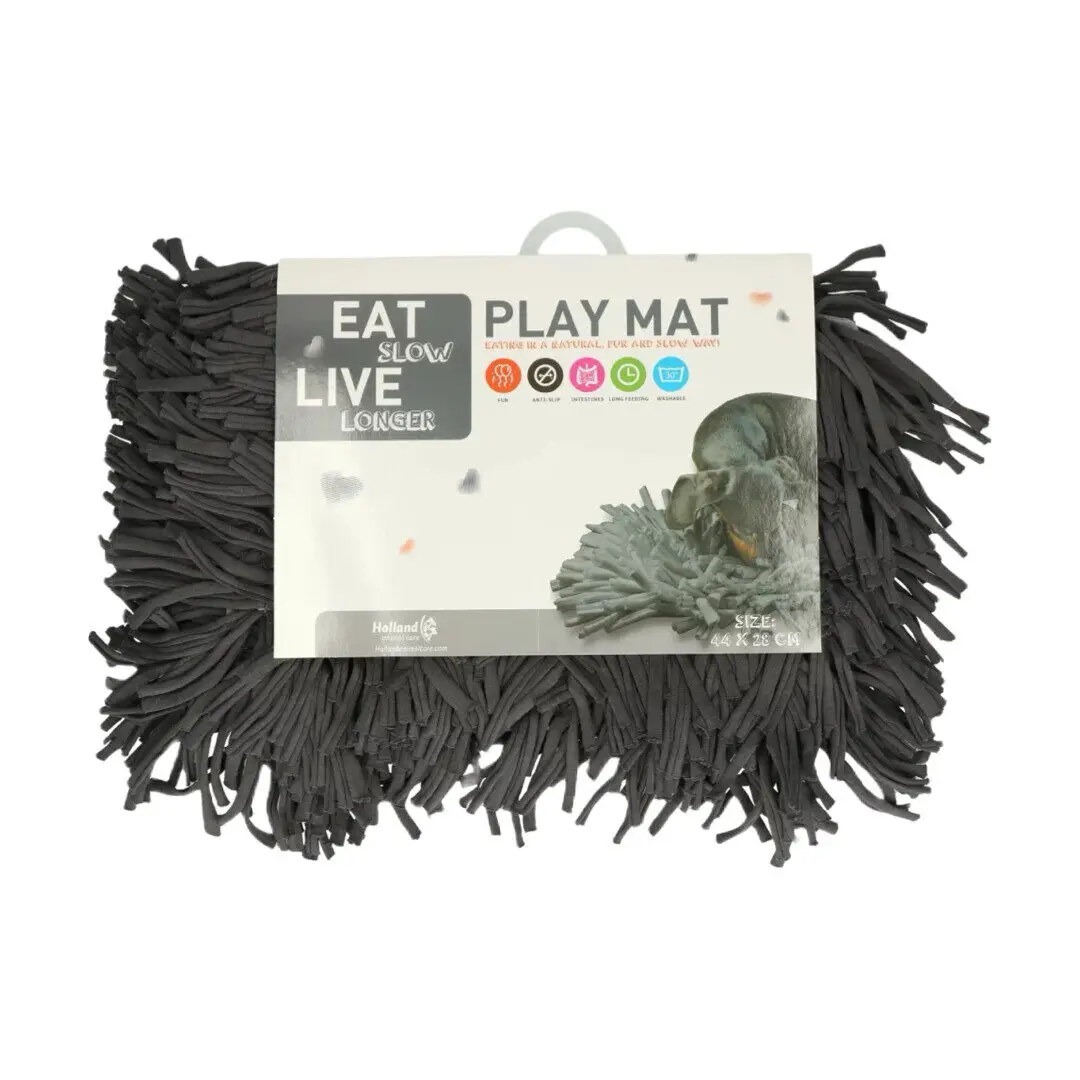 Med Eat Slow Play Mat i grå får du et snusetæppe, der forener leg, aktivering og sunde spisevaner. Måtten er udviklet til hunde og hvalpe, der spiser for hurtigt, eller som har brug for mental stimulering i hverdagen. Når hunden skal bruge snuden til at finde sit foder eller sine godbidder, får den ikke bare en sjov opgave – den spiser også langsommere og roligere.