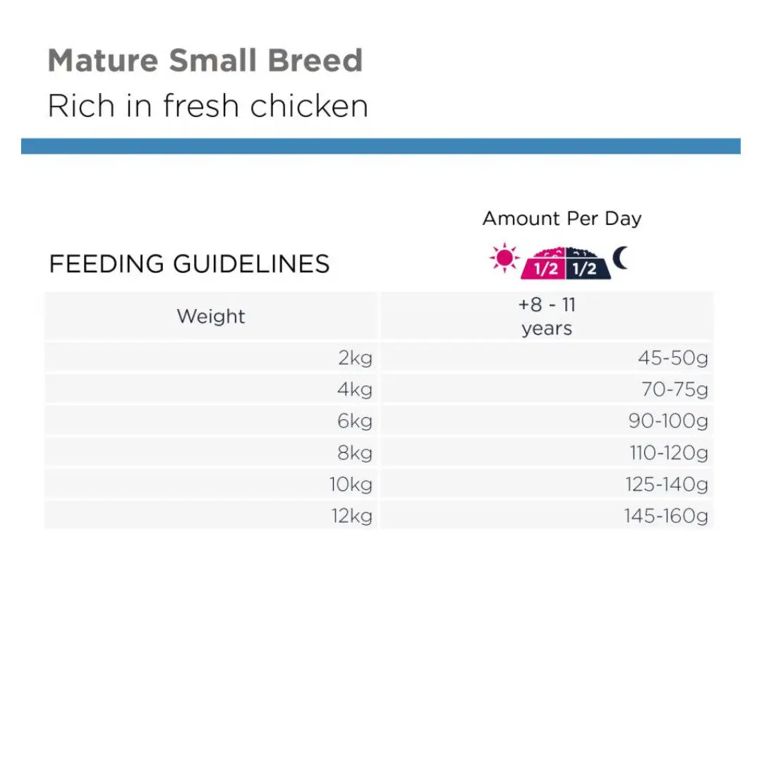Eukanuba Mature Small Breed er et komplet foder til små hunde (0–10 kg) i alderen 8–11 år. Med frisk kylling som hovedingrediens får din hund letoptageligt protein og god smag. L-carnitin hjælper med vægtkontrol, mens glucosamin og calcium støtter led og knogler. FOS og roetrævler styrker fordøjelsen, og omega-3 og -6 giver sund hud og pels. De sekskantede foderpiller understøtter tandpleje med Eukanubas DentaDefense.