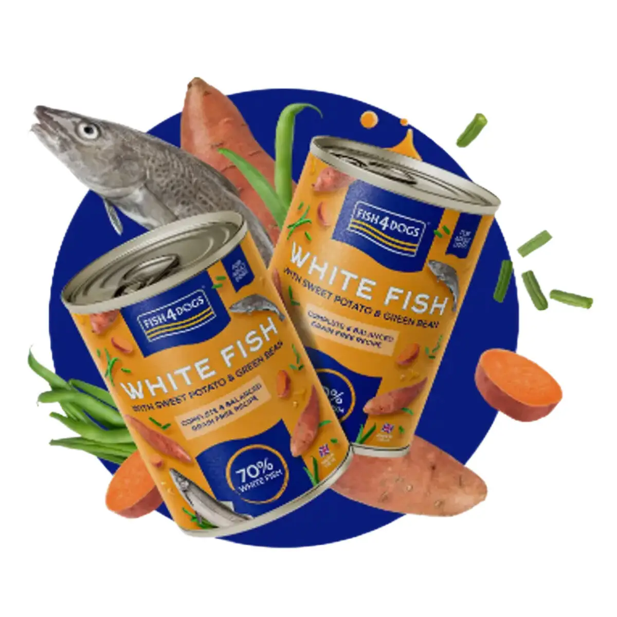 Forkæl din hund med Fish4Dogs Finest White Fish with Sweet Potato – et naturligt, mildt og ernæringsrigt måltid, der forener smag og sundhed i hver eneste portion.