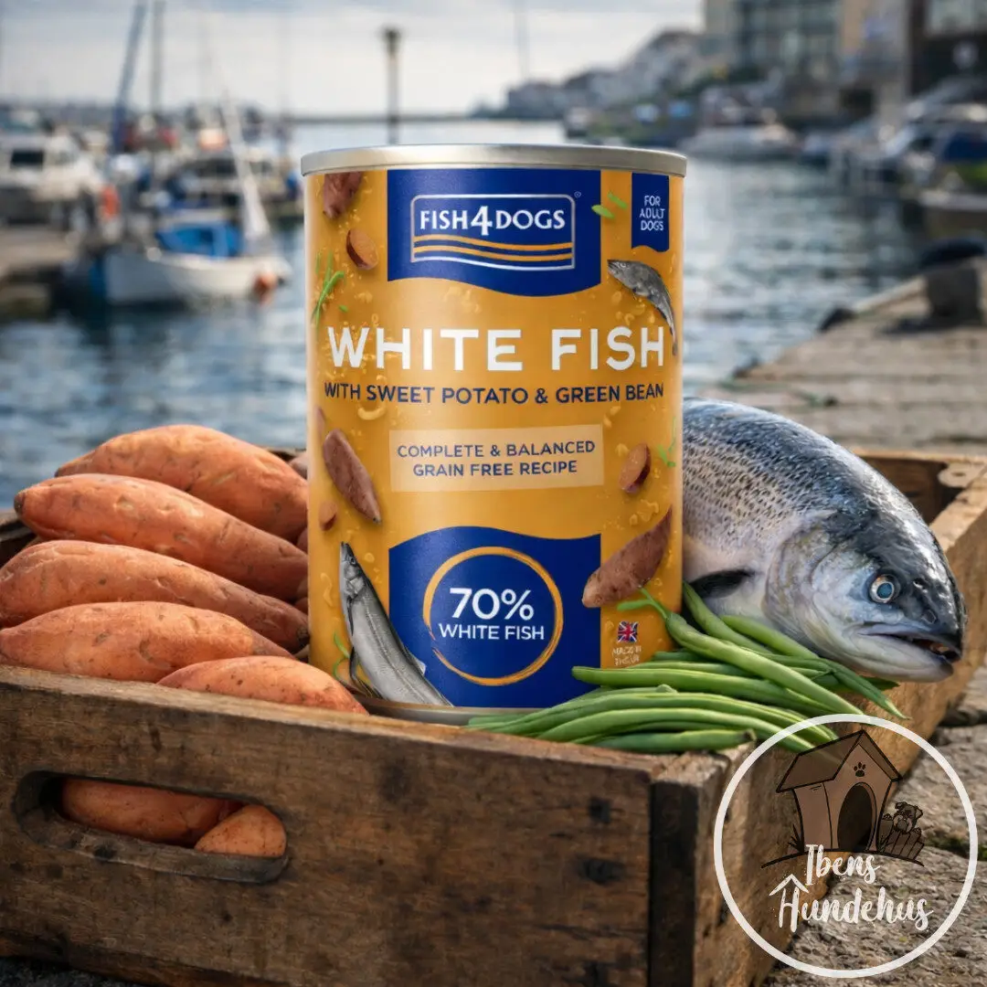 Hos Ibens Hundehus anbefaler vi Fish4Dogs Finest White Fish with Sweet Potato til hunde, der har brug for et mildt, kornfrit og letfordøjeligt vådfoder. Den høje andel af hvid fisk gør det til et særligt godt valg for hunde med sensitiv mave, mens tang og lakseolie tilfører ekstra sundhedsmæssige fordele. Mange ejere oplever, at dette foder giver deres hund en mere stabil fordøjelse og en blankere pels.