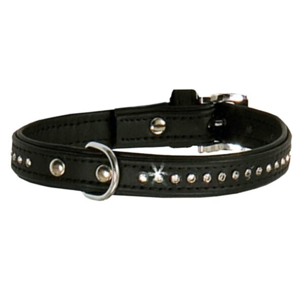 Blødt halsbånd med flotte similisten. Sort ensfarvet halsbånd i kunstskind som er let at rengøre og som ikke tager imod snavs og misfarvninger som traditionelle læderhalsbånd.