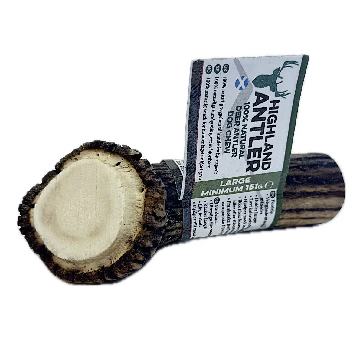 Highland Antler Hel Large er et helt, massivt hjortegevir, der byder på lang tyggetid, naturlig tandpleje og en robust tyggeoplevelse uden tilsætningsstoffer. Det er ideelt til større hunde og kraftige tyggere, som har brug for noget at arbejde med over længere tid. Marven er skjult, så hunden skal bruge både tid og kræfter på at komme ind til smagen – præcis som naturen har tænkt det.