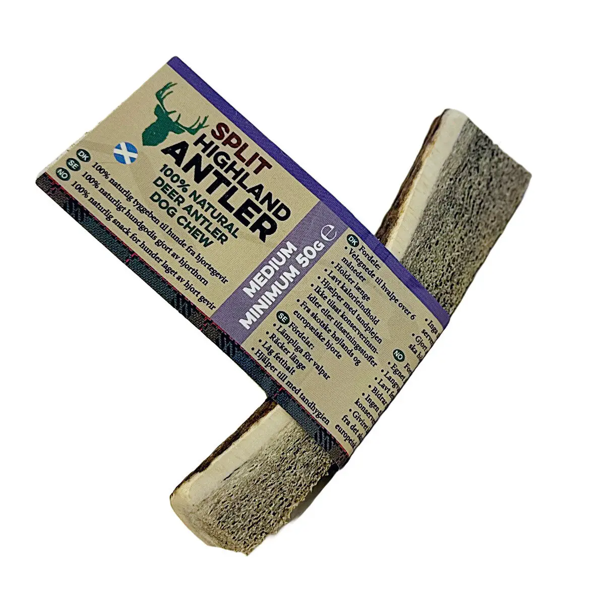 Highland Antler er 100 % naturligt, lufttørret hjortegevir indsamlet i Europa, når dyrene naturligt taber deres gevirer. Der er altså ikke tale om jagt eller slagtning – kun en bæredygtig udnyttelse af en eksisterende ressource. Split-varianten passer især godt til hunde, der foretrækker en hurtigere belønning og smagsoplevelse, da marven er direkte tilgængelig. Tyggetiden varierer alt efter hundens størrelse og bid, men de fleste hunde kan få glæde af geviret i lang tid.
