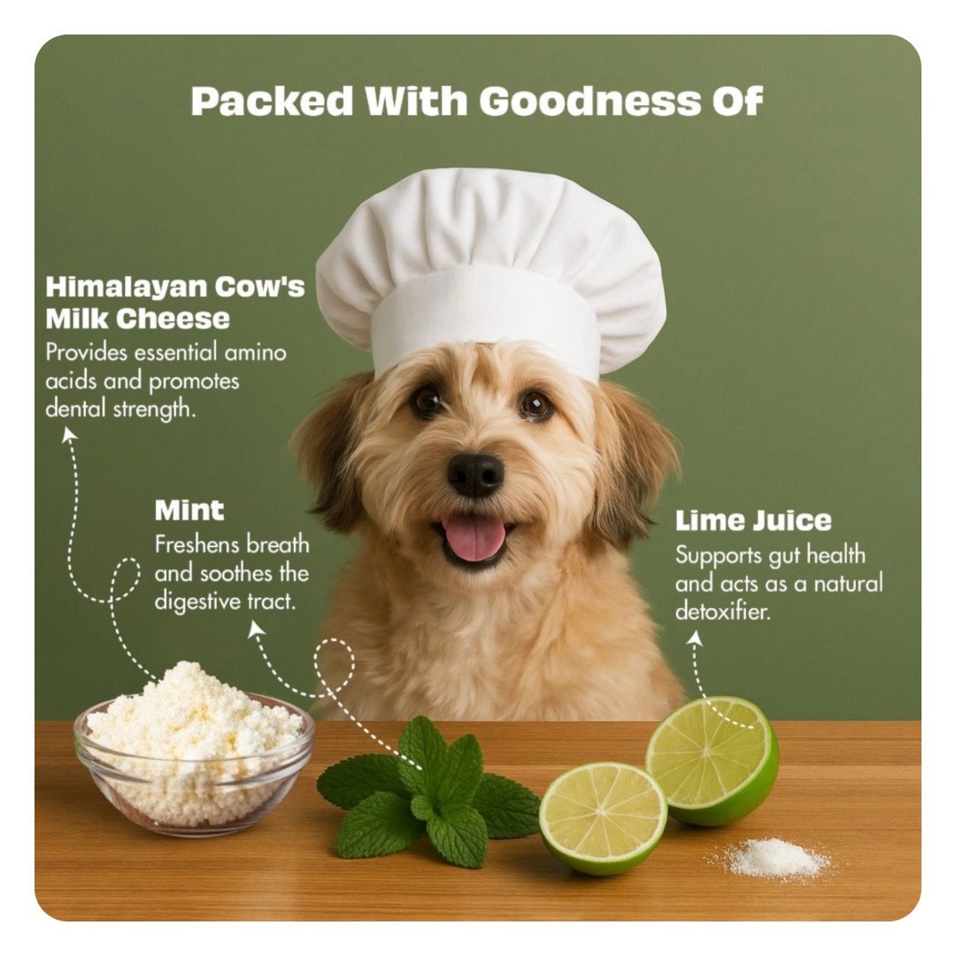 Mint er valgt til denne variant for at give tyggebenet en frisk smag og en mere tandplejeorienteret profil. Mint forbindes ofte med friskere ånde og bruges i mange produkter med fokus på mundhygiejne. I denne opskrift bidrager mint til at gøre tyggebenet ekstra interessant, samtidig med at den forbindes med støtte til at reducere dårlig ånde og hjælpe i kampen mod plak og tandsten.