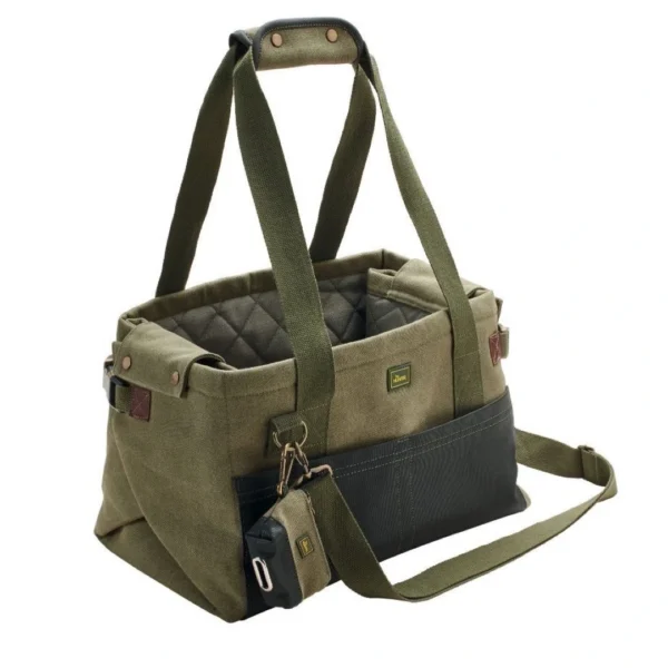 Super smart bæretaske med karabinhage til sikring af dyret. Tasken kan desuden foldes ud og anvendes som rejsetæppe/liggeplads, når man er på besøg andre steder. Leveres med smart hundeposeetui og praktiske yderlommer. Tasken har to bærehanke samt trinløst indstillelige og aftagelige skulderremme, kan bære op til 7 kg. Mål: 40 x 25 x 25 – Slået ud som liggeplads: 92 x 75 cm.