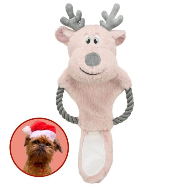 Sjovt og festligt julelegetøj, der kombinerer blød plys med et solidt reb og knitrefolie indeni. Rensdyret giver timevis af sjov og er perfekt til både trække- og kasteleg. Den bløde krop gør det også velegnet til hygge og putning efter leg. Et sødt og dekorativt legetøj, der skaber ægte julestemning i hjemmet – ideelt som gave til hunden i december.