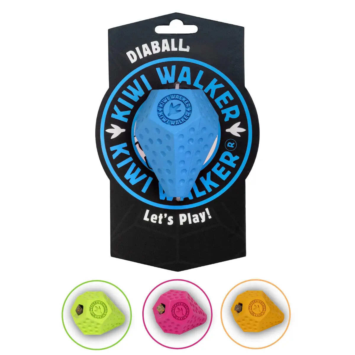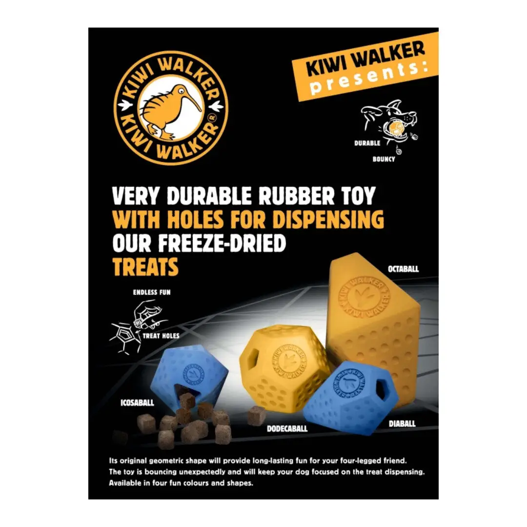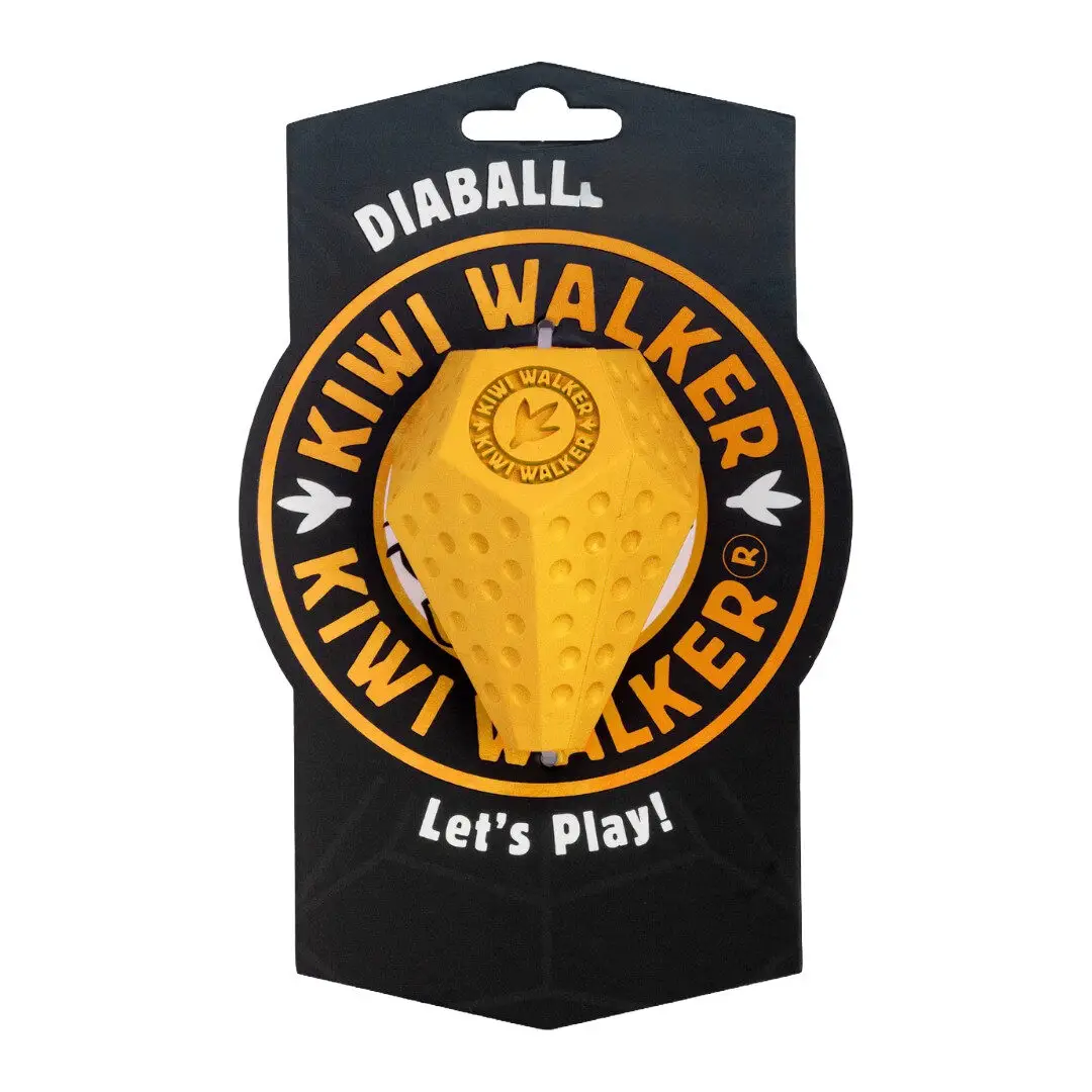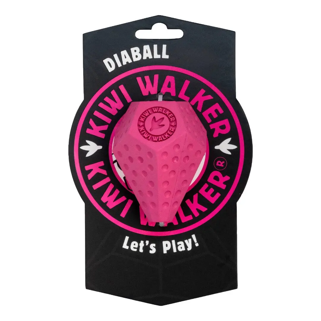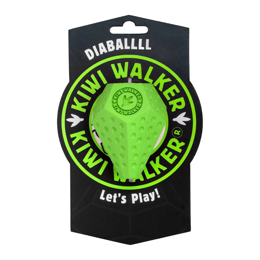Kiwi Walker Diaball Maxi er et robust aktiveringslegetøj udviklet til store hunde med masser af energi. Den diamantformede bold hopper uforudsigeligt, og de indvendige vægge gør det ekstra udfordrende at få godbidderne ud. Fremstillet af slidstærkt, fleksibelt gummi, der tåler kraftige kæber og er nemt at rengøre. Fås i flere former og fire friske farver: blå, orange, pink og grøn – perfekt til sjov, aktivering og belønning for din store hund.