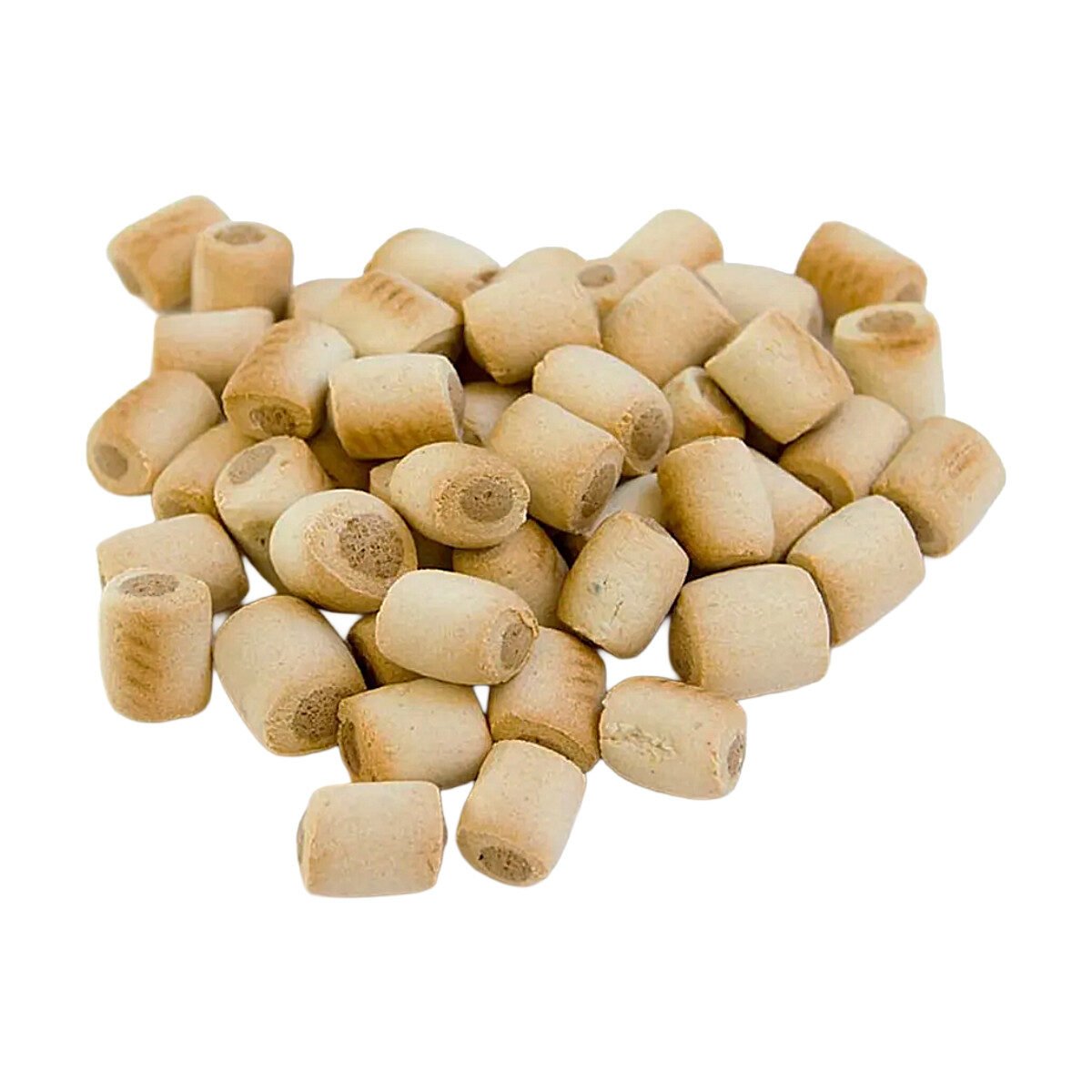 Små klassiske hundekiks med sprød lys skal og lækkert fyld med oksekødssmag. Pakket i kræmmerhus med ca 250 g.