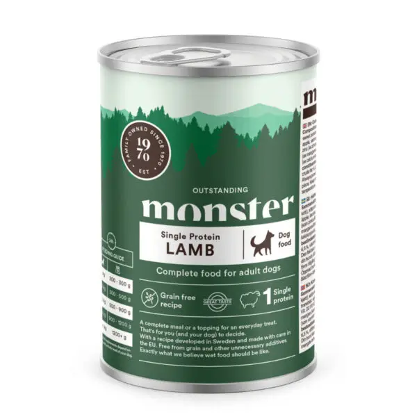 Hvis din hund har en sart mave eller reagerer på visse proteiner, er det afgørende at vælge et måltid, der både er nænsomt, velsmagende og ernæringsmæssigt balanceret. Monster Single Protein Lam er netop det: Et komplet, kornfrit vådfoder med lam som eneste proteinkilde, skabt til hunde med allergi, foderintolerancer eller følsom fordøjelse.