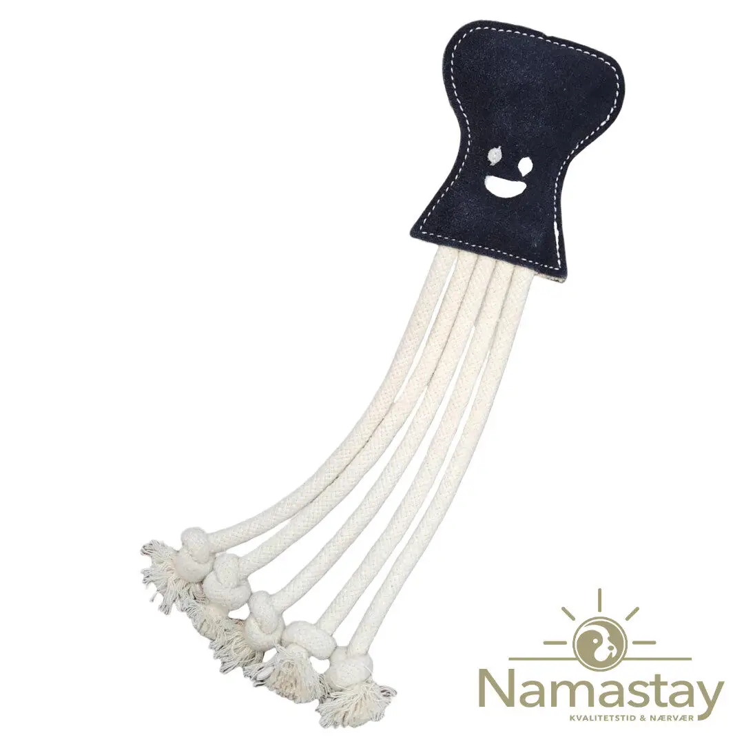 Denne charmerende blæksprutte fra Namastay er håndlavet i Indien af ruskind/bøffellæder, farvet med naturlige, kemifrie farver. De seks lange arme af bomuldstov og jute er perfekte til ruske- og trækkelege, mens den indbyggede squeaker af genanvendt plastik gør legen endnu sjovere. Med sine 35 x 10 cm passer den til både små og mellemstore hunde, der elsker varieret og stimulerende leg. Godt for dig, din hund og vores jord.
