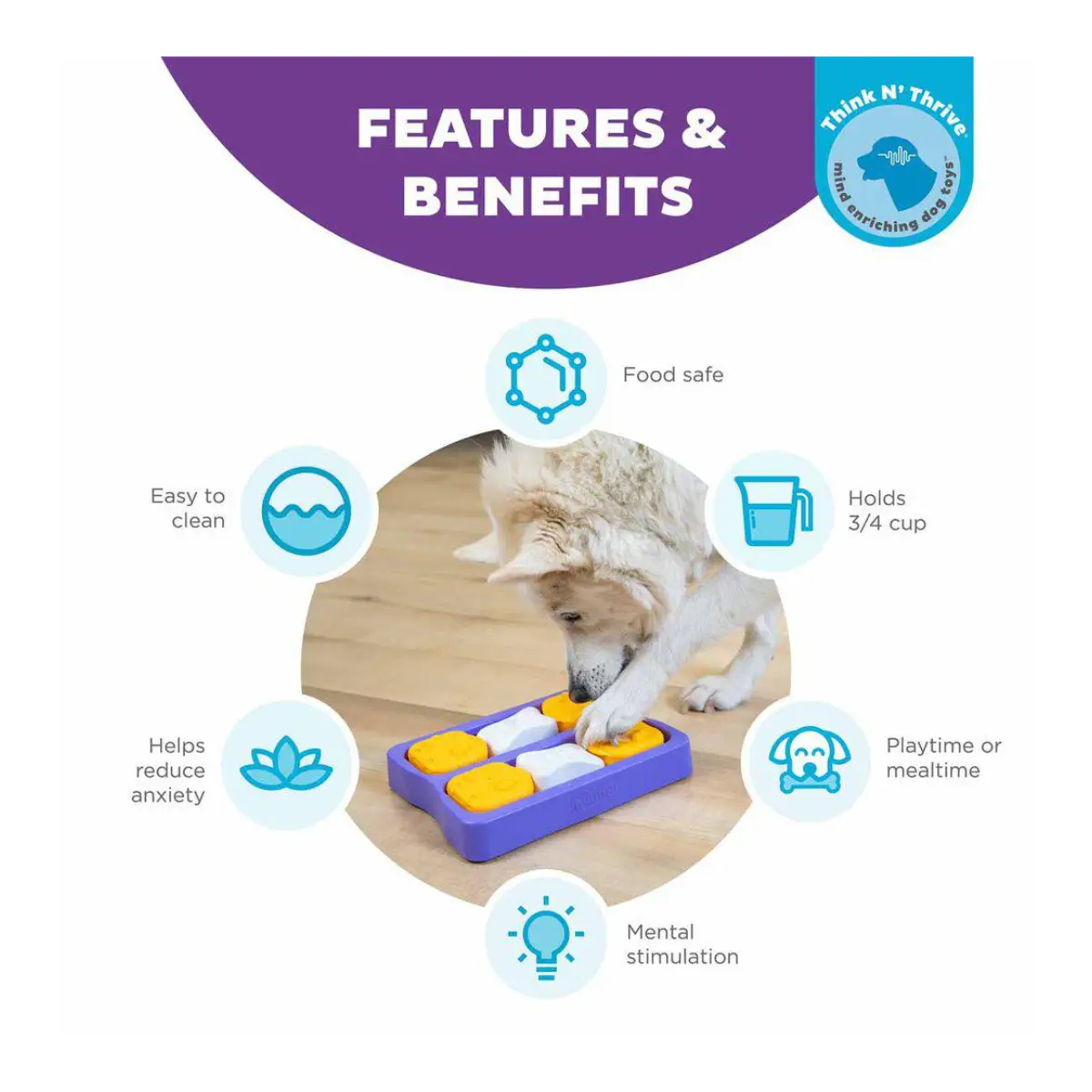 Fordele ved mentalt stimulerende spil Dette hundespil ikke kun underholder din hund, men styrker også båndet mellem hund og ejer ved at engagere jer begge i sjov og interaktiv leg. Det kræver koncentration og fokus fra din hund, hvilket giver mental stimulering svarende til 30 minutters fysisk aktivitet på bare 15 minutters spilletid.