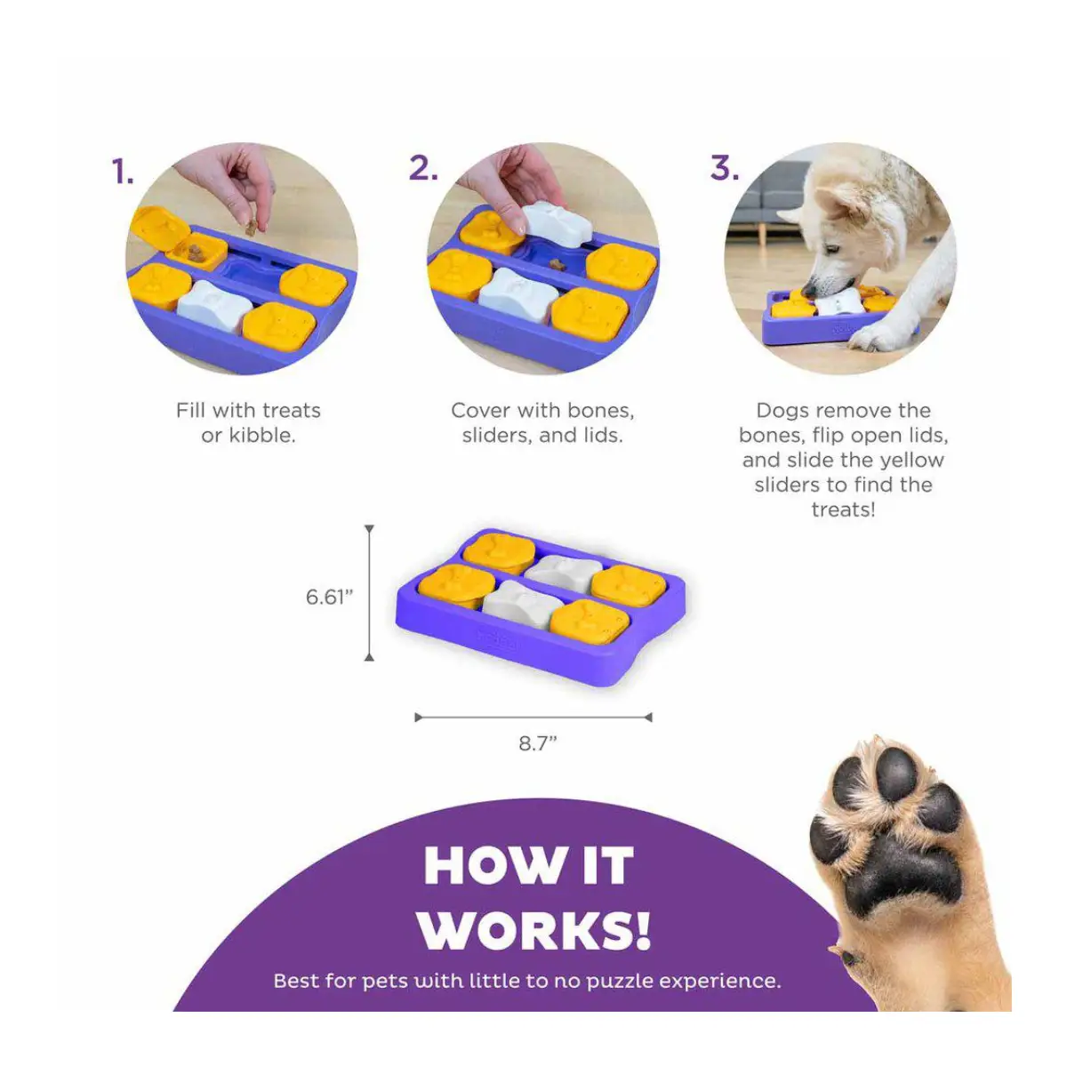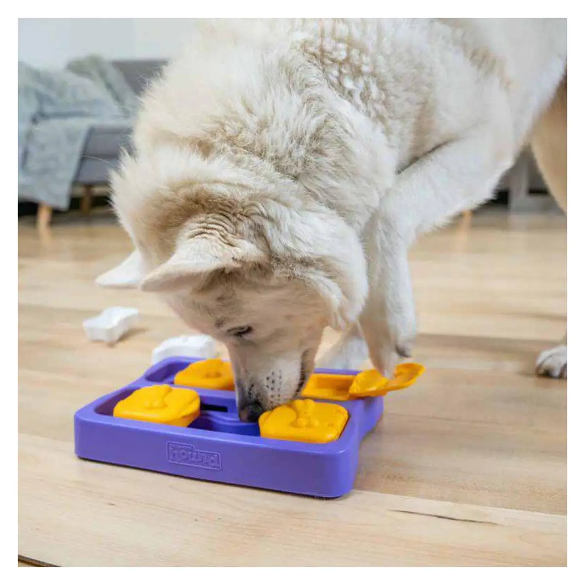 • Mental stimulering: Spillet holder din hund engageret og stimuleret, mens den søger efter gemte godbidder. Det hjælper med at reducere kedsomhed, stress og destruktiv adfærd ved at aktivere naturlige jagtinstinkter og give hunden en sund form for hjernegymnastik.