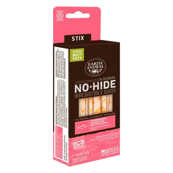 No-Hide Sticks Med Laks er en serie af naturlige, letfordøjelige tyggepinde skabt til hunde, der elsker en god tyggeoplevelse, men som ikke tåler råhud eller ikke trives med hårde tyggeben. Disse sticks bygger på samme filosofi som de større No-Hide ben: rene ingredienser, høj fordøjelighed og en tyggekonsistens, der minder om råhud – uden at indeholde hud overhovedet. De ca. 11 cm lange sticks passer perfekt til små hunde og unge hunde, der har brug for en mild, men engagerende tyggeaktivitet.