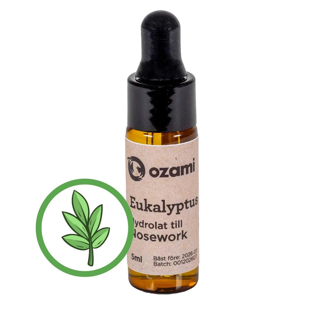 Flasken indeholder 5 ml eukalyptus hydrolat i høj kvalitet. Produktet er fremstillet som et naturligt biprodukt af æterisk olieproduktion og leveres i en lille glasflaske med pipette. Denne vare kommer fra svenske Ozami.