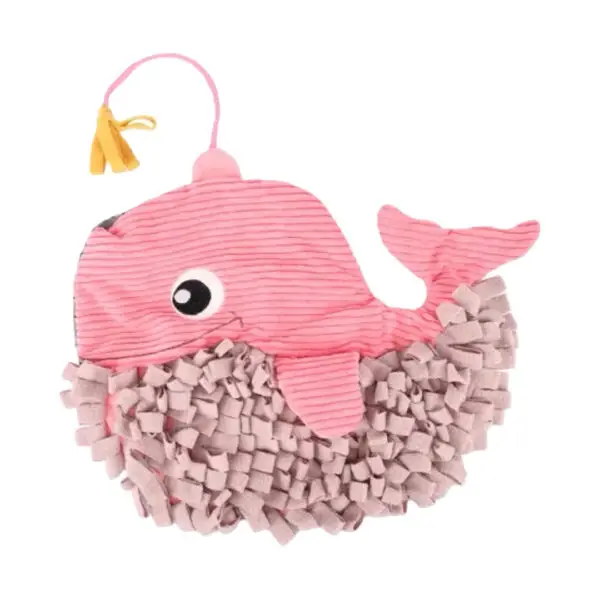 Denne nuttede hval fra Flamingo kombinerer sansemåtte, leg og fodersøg i ét legetøj. De mange frynser og lommer giver mulighed for at gemme snacks eller foder, så hunden kan snuse sig frem til belønningerne. De forskellige teksturer og knitrefolien i kroppen stimulerer sanserne og gør legen spændende og engagerende. Perfekt til hvalpe og små hunde, både til daglig aktivering og hyggelig rolig snuseleg.
