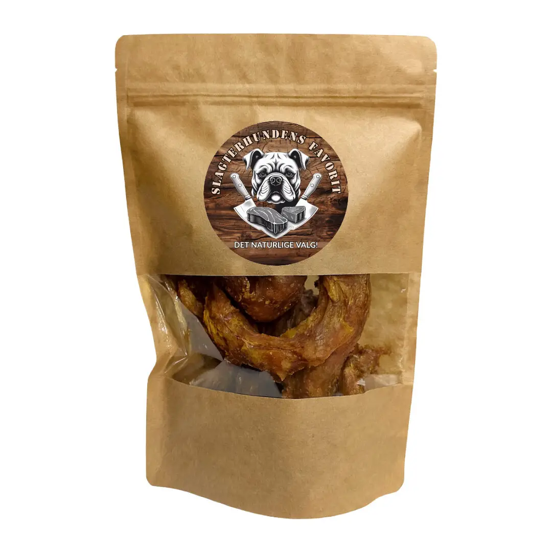 Forkæl din hund med Slagterhundens Gourmet Snack – Tørrede Kyllingehalse, en snack der kombinerer smag, sundhed og omtanke for miljøet.