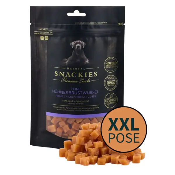 Snackies XXL Pose Kyllingetern 400 g er en ekstra stor pose hundegodbidder til dig, der bruger mange godbidder i hverdagen. Denne variant er udviklet specifikt til træning, belønning og daglig forkælelse, hvor der er behov for en godbid, der både er velsmagende, letfordøjelig og praktisk i brug. Med sin store mængde er posen ideel til hundeejere med aktive hunde, flere hunde eller et højt træningsniveau, hvor kvalitet og økonomi skal gå hånd i hånd.