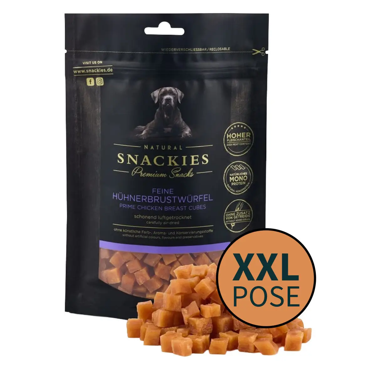 Snackies-serien er kendetegnet ved rene råvarer, enkel sammensætning og skånsom forarbejdning. XXL-udgaven er skabt til dem, der ønsker høj kvalitet i større mængder – uden at gå på kompromis med smag, fordøjelighed eller anvendelighed.