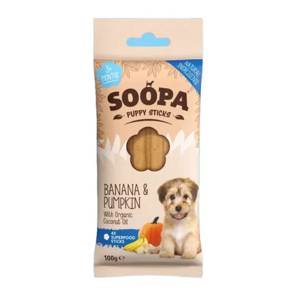 Forkæl din Hvalp med Soopa Puppy Sticks med Banan & Græskar – Veganske Tyggepinde til Hvalpe