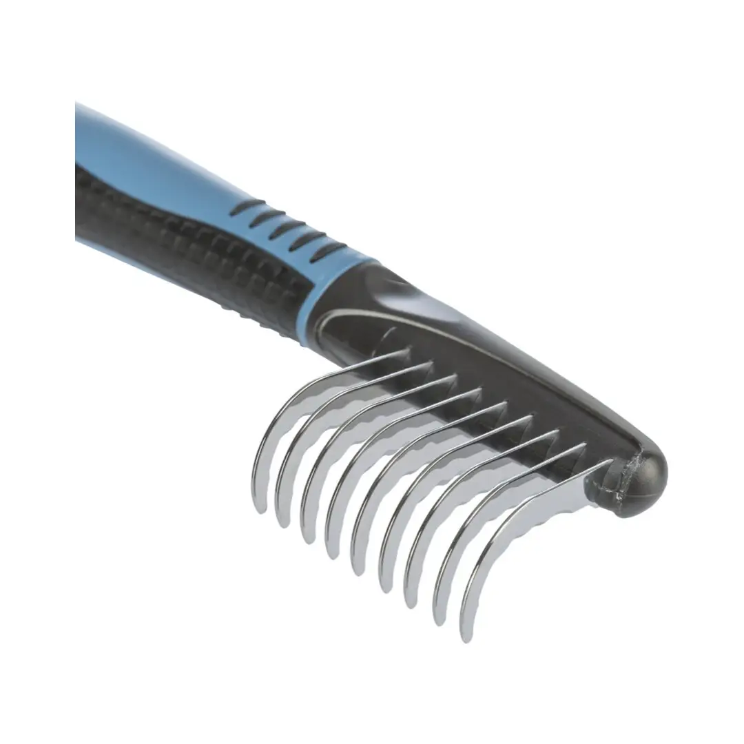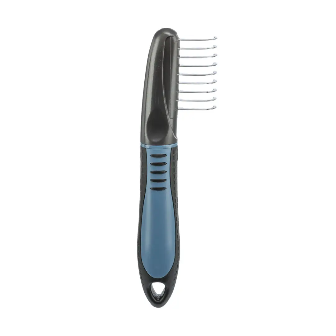 Smart redskab til når der er opstået en lille filtknude i pelsen. Filtersplitterens spids føres ind under filten og køres forsigtigt frem og tilbage og skærer derved filterknuden op uden at være til fare for at komme til at skære i huden. Når filten er skåret op, kan den børstes ud og fjernes ved hjælp af karte og metal kam. Brug med fordel en filterspray på filtknuden inden du går i gang. Kan også anvendes til at udtynde pelsen ved at trække den nænsomt igennem pelsen af flere omgange.