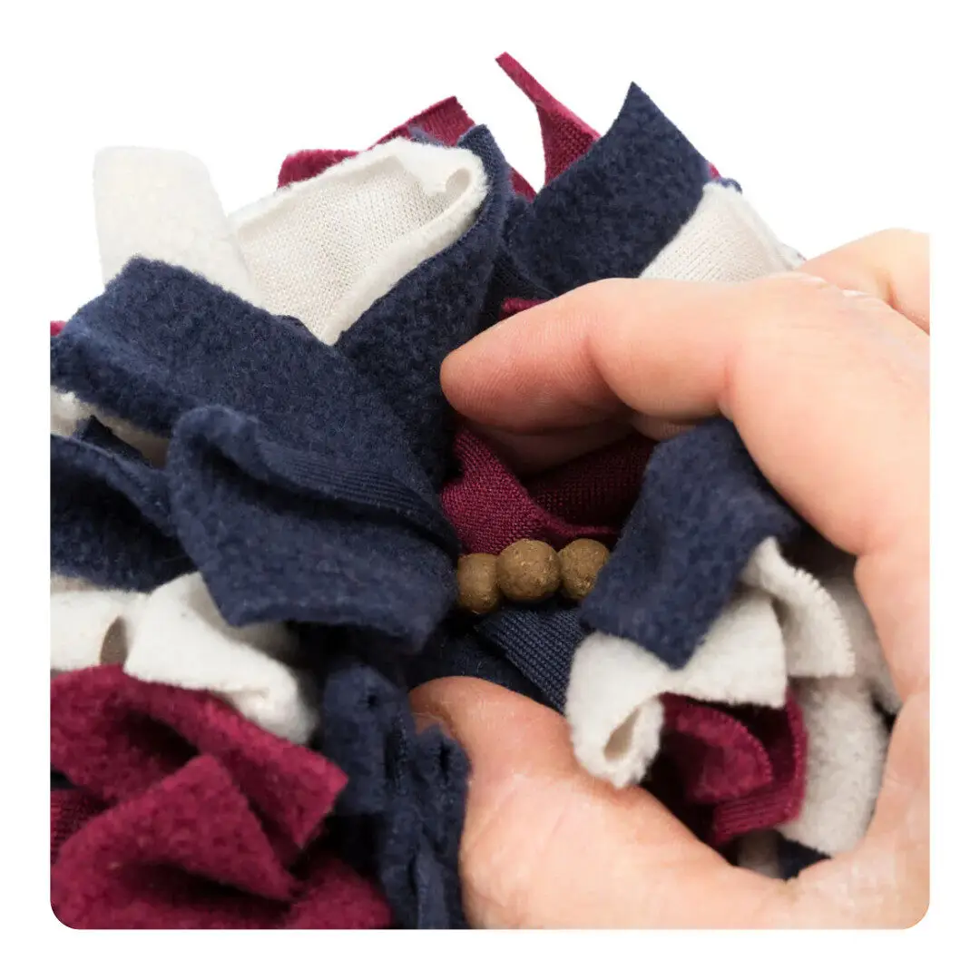 Denne farverige snusebold gemmer godbidder eller tørfoder mellem bløde kvaster, så hunden skal bruge snude og poter for at finde dem. To forskellige kvastlængder gør det sværere at “grovæde”, og snuselegen fremmer både langsommere spisning og mental stimulering. Perfekt til indendørs aktivering – og til hunde, der spiser for hurtigt. Ideel til både små snacks og hele måltider. Assorterede farver.