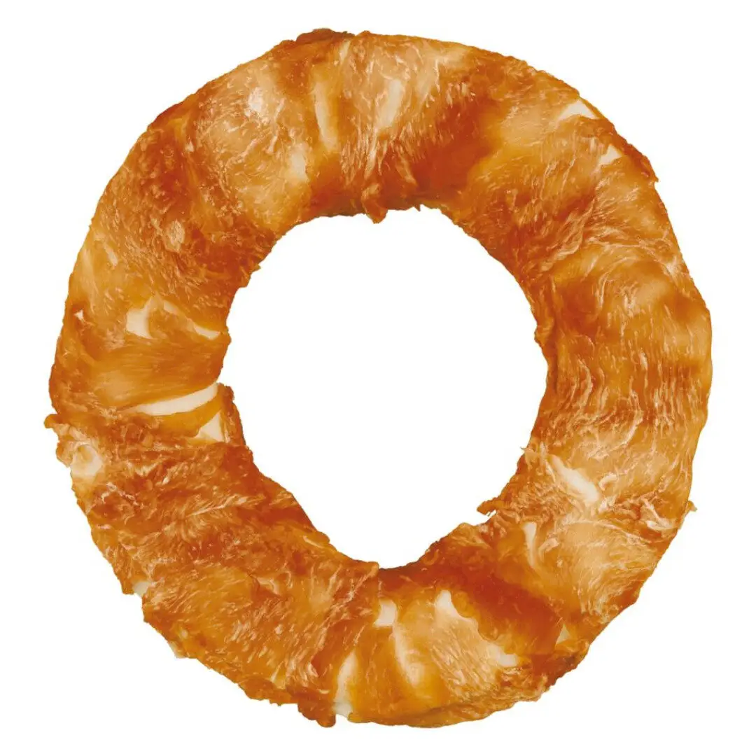 Den faste råhudskerne giver en solid tyggeudfordring, som motiverer hunden til at arbejde med både tænder og kæbemuskler. Tyggeringen er væsentligt større end almindelige tyggeben og derfor oplagt til hunde, der foretrækker længerevarende tyggetid og en mere markant form. Kyllingestrimlerne omkring ringens overflade gør oplevelsen ekstra fristende og øger duften, så selv kræsne hunde ofte bliver nysgerrige.