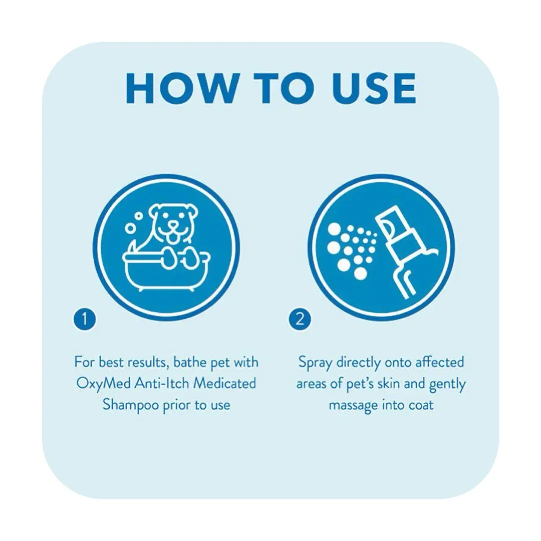 For optimal effekt anbefales det at bade din hund med OxyMed Anti-Itch Medicated Shampoo før brug. Ryst flasken grundigt, spray direkte på de berørte områder og massér blidt ind i huden. Sprayen kræver ingen skylning og kan anvendes så ofte som nødvendigt for at give øjeblikkelig lindring.