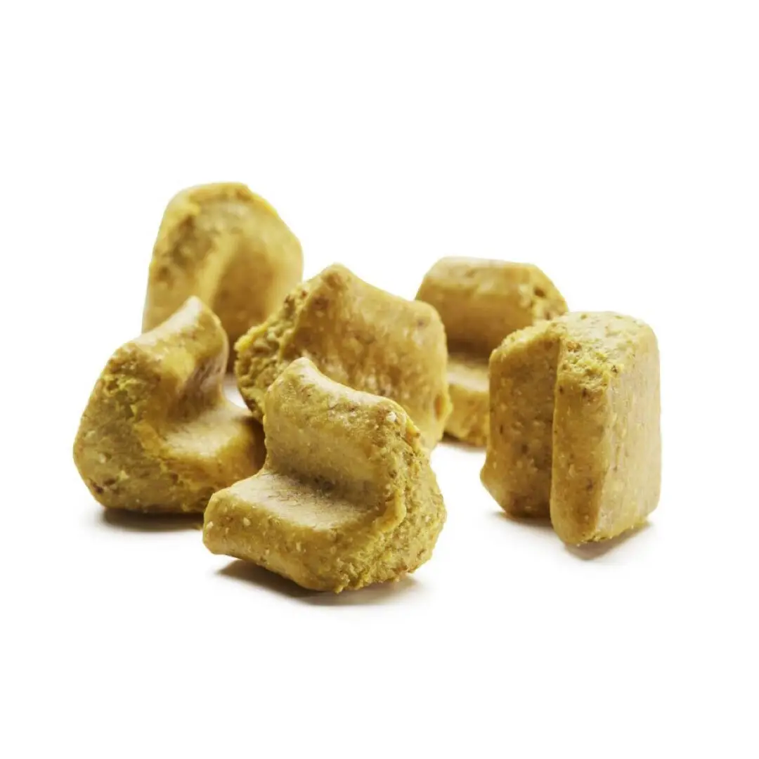 Ingredienser: Kartoffel, 20% Favabønne, plantebaserede biprodukter, 1% sanddorn, 0,5% curcuma.