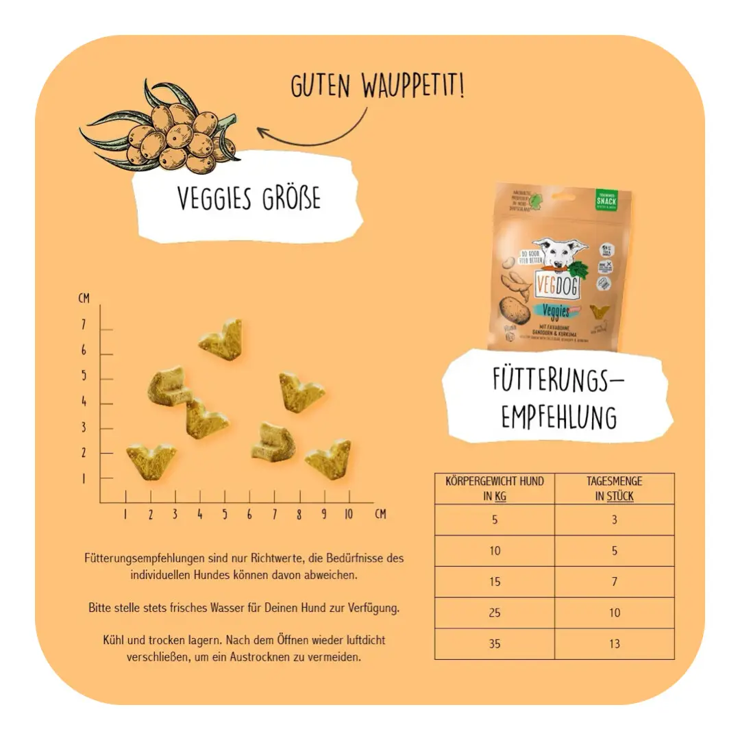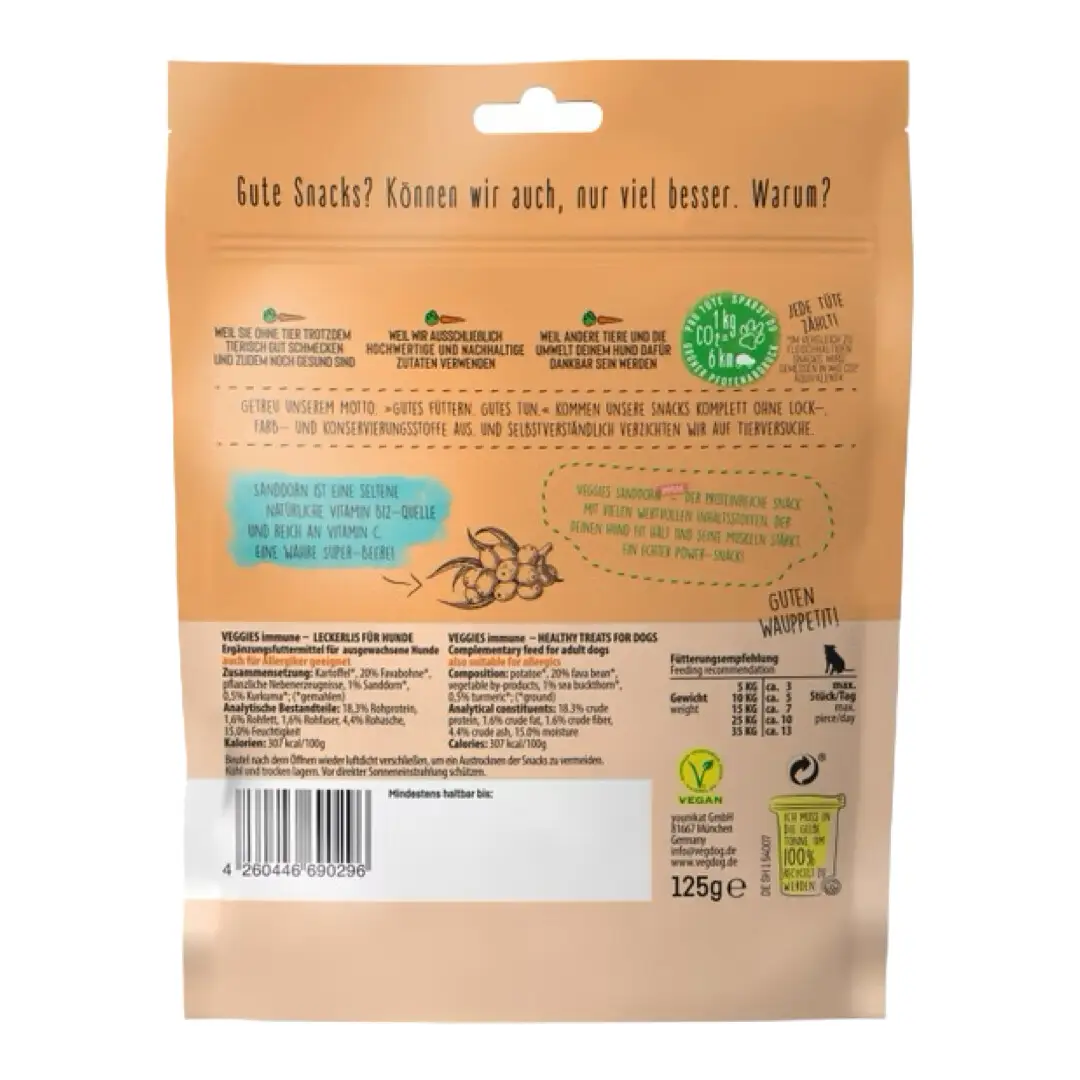 Når du vælger VEGDOG Veggies Immune, får du ikke bare en sund snack til din hund – du investerer også i dens langvarige sundhed. De plantebaserede ingredienser giver din hund et naturligt boost af vitaminer og mineraler, som styrker dens immunforsvar og fremmer en sund fordøjelse. Favabønner, der er rige på protein, sikrer, at din hund får nok energi til sine daglige aktiviteter, mens sanddorn og curcuma hjælper med at styrke immunforsvaret og reducere inflammation.
