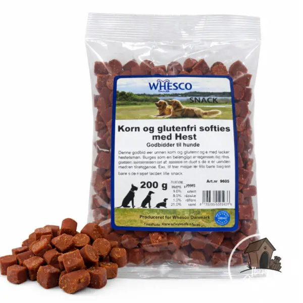 Whesco Softies med hest er et oplagt valg for hundeejere, der ønsker en blød, kornfri og letfordøjelig træningsgodbid med en alternativ proteinkilde.