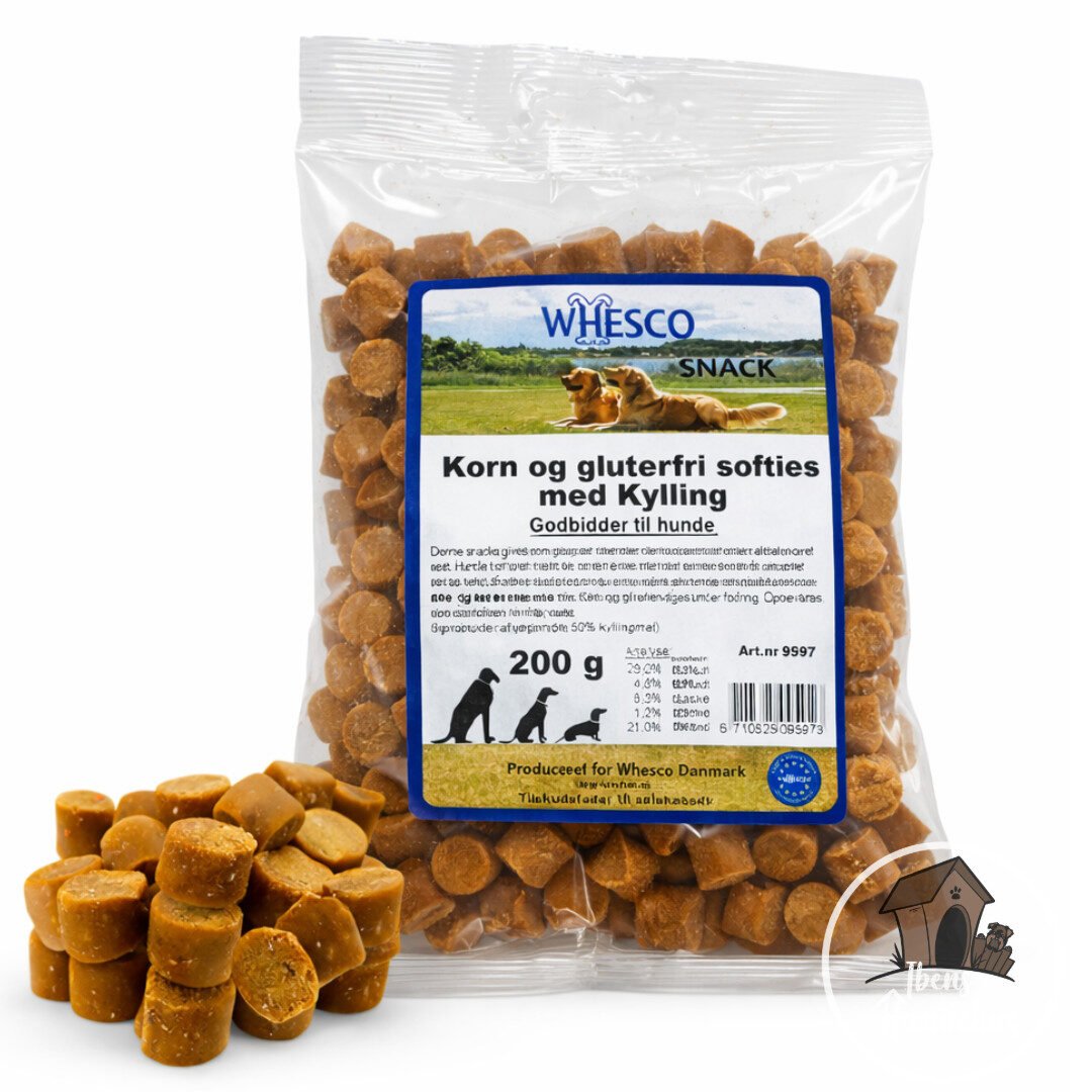 Whesco Softies Kylling er både kornfri og glutenfri, hvilket gør dem til et godt valg for hunde, der ikke trives med korn i kosten. Den enkle sammensætning er udviklet med fokus på god fordøjelighed og høj anvendelighed under træning.