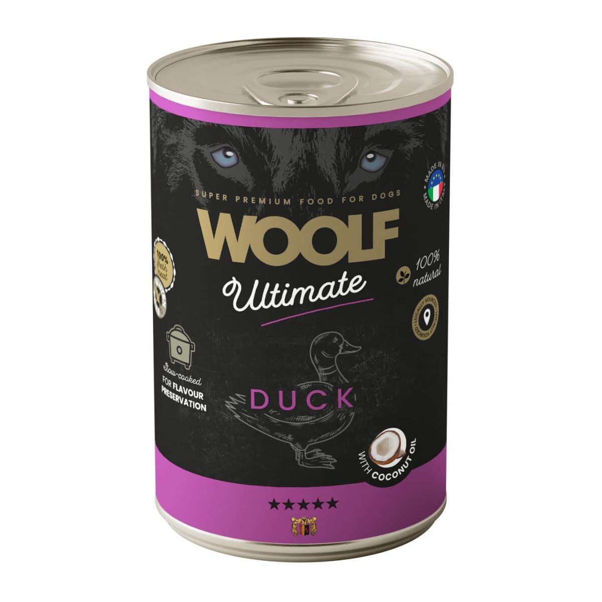 Woolf Ultimate Duck with Coconut Oil er et naturligt vådfoder med 96 % frisk andekød og tilsætning af kokosolie. Foderet er både monoprotein og single protein, hvilket gør det ideelt til hunde med allergi eller sensitiv fordøjelse. Slow-cooked i Italien af lokale råvarer for at bevare både smag og næringsstoffer. Glutenfri opskrift uden kunstige tilsætningsstoffer.